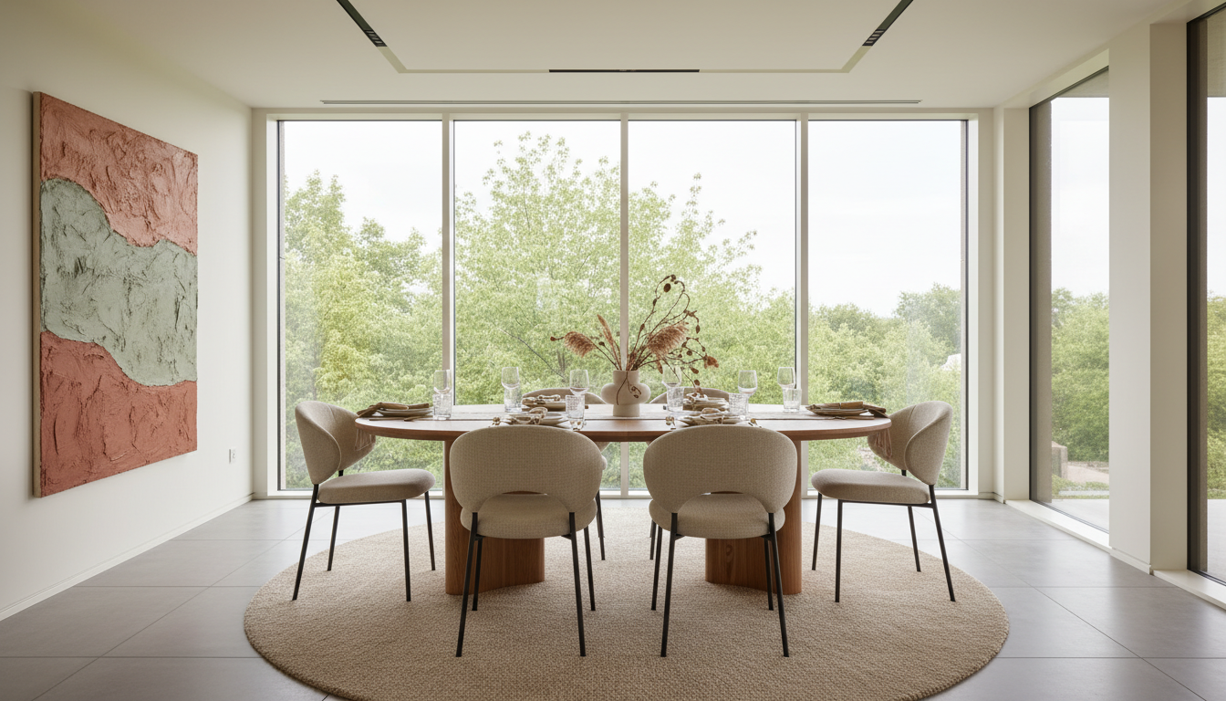 L’éclairage joue un rôle primordial. Une suspension design, centrée au-dessus du plateau, permet de marquer la zone repas. Optez pour des formes organiques ou des luminaires en grappe qui rappellent la courbe de la table. Au sol, un tapis texturé (laine bouclée, jute) délimite l’espace et apporte du confort acoustique, essentiel pour les longs dîners.